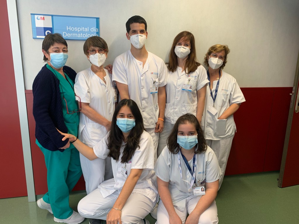 Enfermera de consulta. Son las enfermeras con las que cuenta el servicio. Ella realizan su labor como enfermeras: curas, quirofanos, administrar tratamientos, fototerapia, pruebas de contacto, seguimiento de pacientes, hospital de día, pedidos, y a todo esto las añadimos en la mayoría de los ensayos clínicos siendo el equipo no ciego que administra medicación a los pacientes y las back up de la study nurse a la hora de las extracciones de sangre y vigilancia de los pacientes en las horas siguientes a los tratamientos.