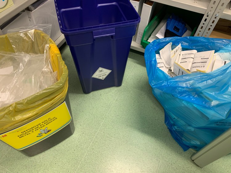 También generamos muchos residuos con la medicación usada y devuelta por los pacientes, la cual nos quedamos y hacemos la contabilidad de las pastillas que se han tomando para comprobar la adherencia al tratamiento en el ensayo. Una vez monitorizada por los CRA, y su visto bueno procedemos también a su destrucción, muchos de los ensayos la envían a su central de tratamiento de residuos las medicaciones sobrantes y muchos otros la dejan en el hospital para que la destruyamos en el circuito habitual del hospital.
