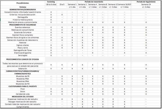 Este cuadro es de cada protocolo como una extensión del coordinador, el cual se organiza por filas (procedimiento a realizar) y columnas (día del estudio donde toca visita), donde y en muchos de los estudios aparece también la ventana de días, que tienes entre visita y visita para realizar cada procedimiento, sin que sea una desviación del protocolo.